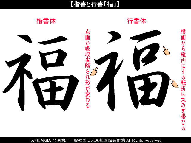 たとえば上の「福寿」の「福」という漢字は、楷書体と比較すると、行書体は、以上の画像のように、次の点画へと移行する過程で点画が吸収されたり省略されたりして形が変わっています。そして丸みを帯びた転折があります。